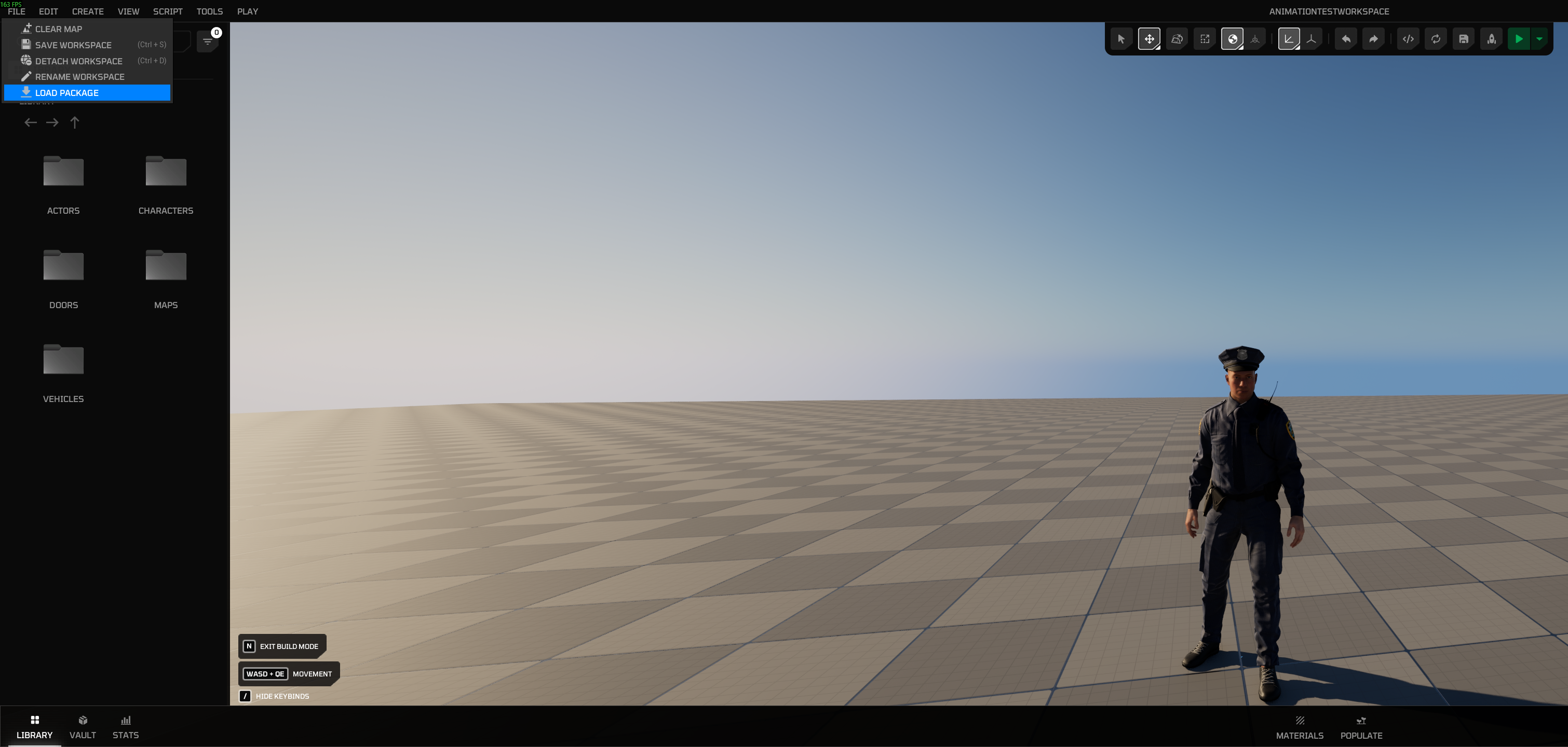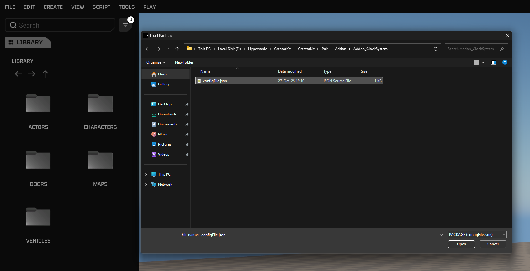 After creating your workspace, open build mode and import the package you created in Creator Kit HELIX Packaging Tool. To do that, click File -> Load Package from top bar, navigate to your package folder cooked by Creator Kit, and select