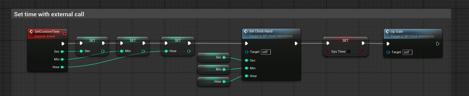 main.luascript to execute our custom event on spawned blueprint actor. The same syntax can be used for calling any function in spawned actors.-- Manually set time on spawned clock with our blueprint defined event ClockActor:SetCustomTime(0,30,5) -- second, minute, hour