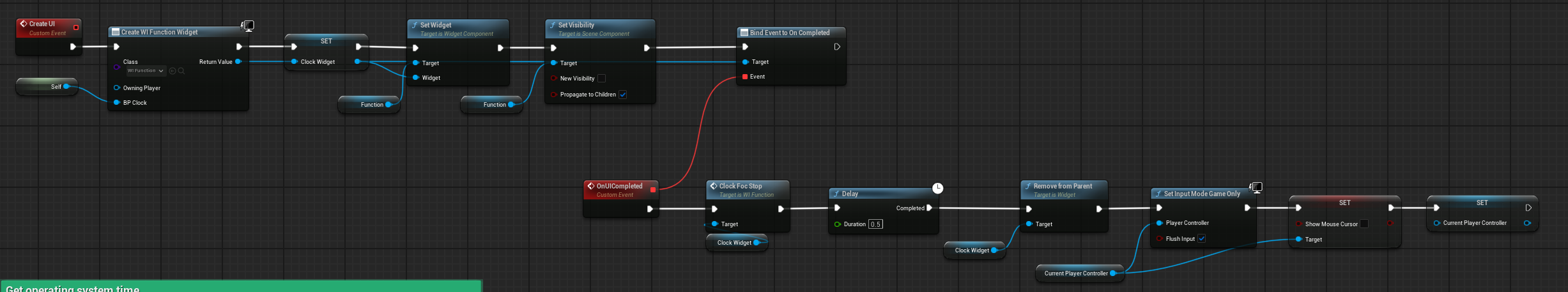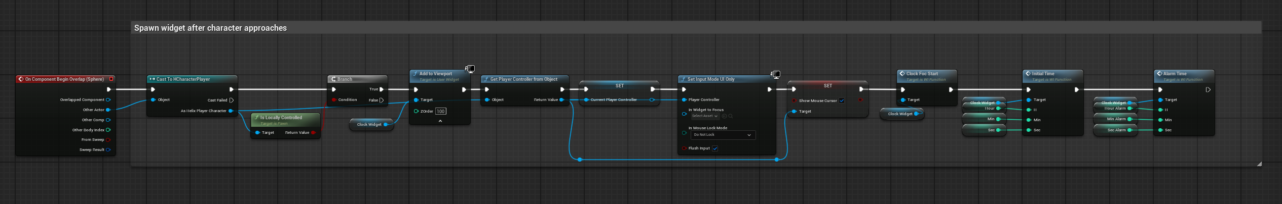 We have a basic logic in the blueprint to spawn an UMG widget on screen as shown below. After walking towards the clock, the widget automatically spawns on the screen to tweak the time.