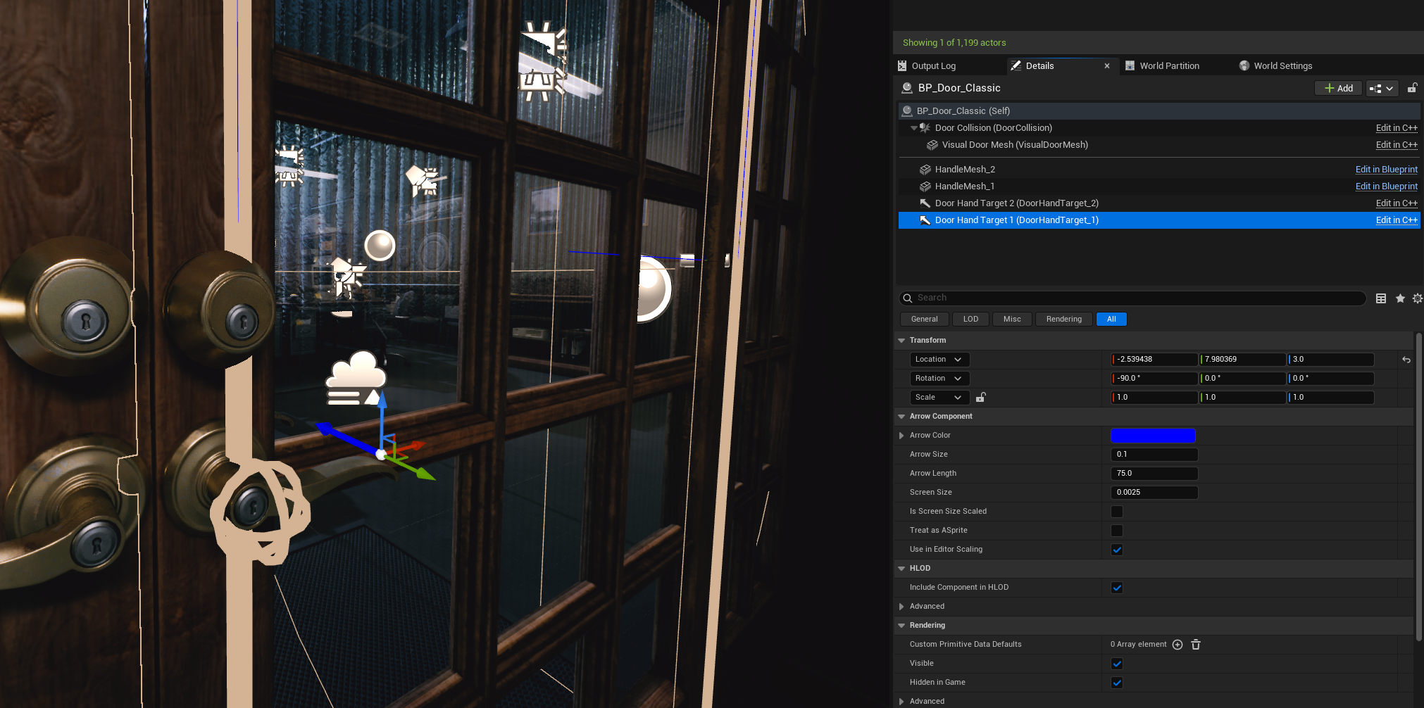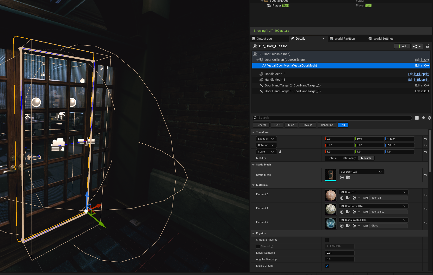 Find the Visual Door Mesh component in your placed actor and change its mesh to the door static mesh previously used in the level. Tweak its transform to correctly center actor location as shown below.