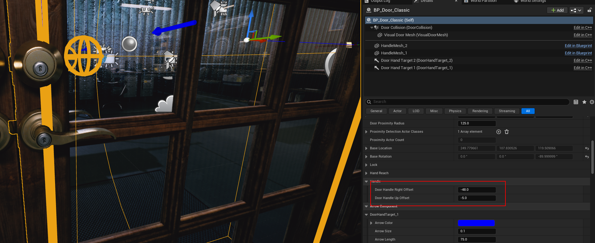 Tweak the location of door handle marker from Door Handle Right Offset and Door Handle Up Offset properties of the actor. The small orange sphere shape should approximately placed onto your door handle's connection point to door.